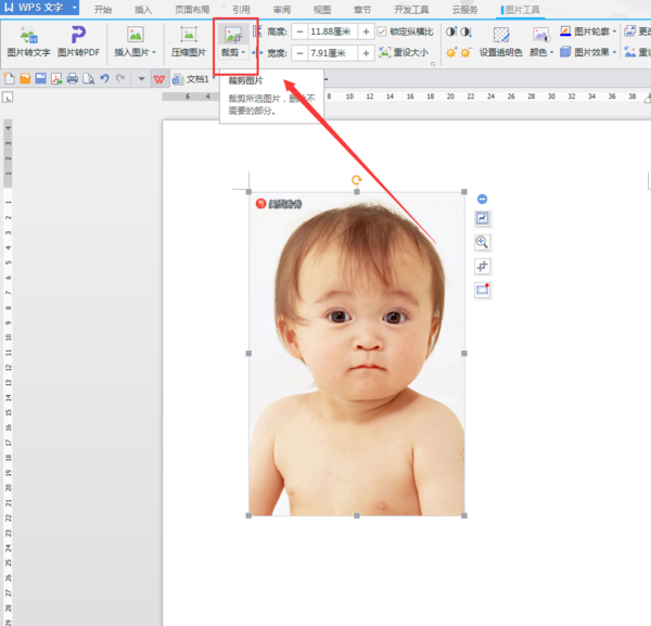 二、然后,鼠标左键点击图片,在图片右侧的图片工具中点击“裁剪图标”,点击打开。