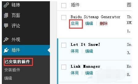 5、到插件-已安装的插件找到Baidu Sitemap Generator之后点击启用,如图。