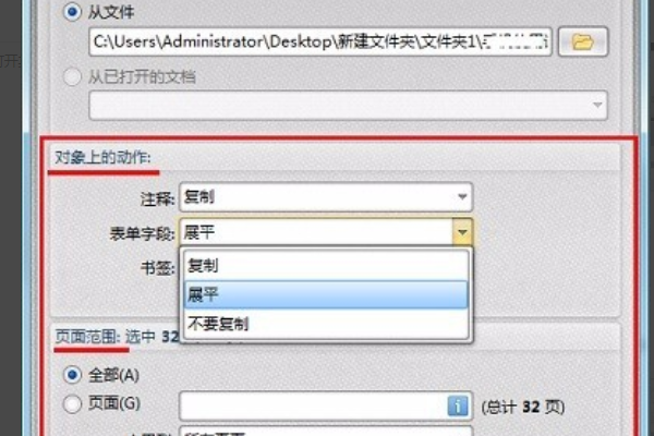 4、在对象上的动作中可以全部选“复制”选项;在页面范围中选择所需合并的页面。