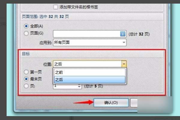 5、最后在目标中设置文件合并的顺序,设置完成后点“确认”按钮。两个pdf文件就合并成功了。