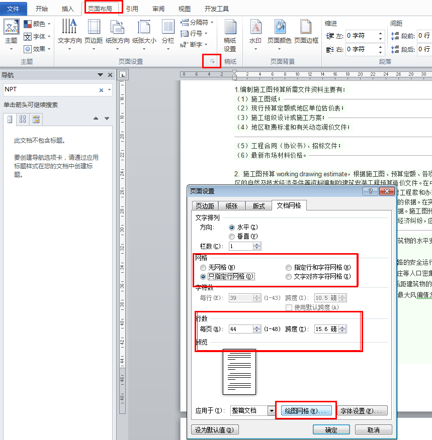 2、单击“页面布局”选项卡,单击“页面设置”组右下角的对话框启动器,在打开的“页面设置”对话框中选择“文档网格”、“绘制网格”,接着在打开的“绘图网格”对话框中设置“水平间距:1厘米”、勾选并设置“垂直间距:1厘米”,“垂直间隔:1”“水平间隔:1”,然后单击“确定”,页面调出网格线。