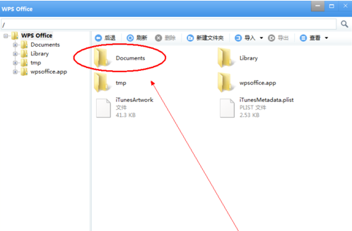 第六步:点击文件夹Documents,进入该文件夹,在wps office查看的文件都在此文件夹下,所以导入的文件也要放在此文件夹下才能查看。如图: