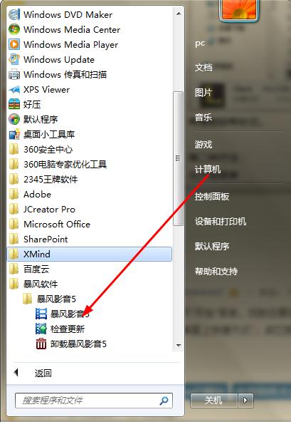 在开始菜单找到所有程序:下面我们以暴风影音5为例: