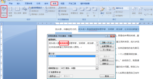1、依次点击“审阅”、“拼音和语法”,程序就会对文档进行检查,有认为错误的地方,就会通过对话框让你处理。见下图: