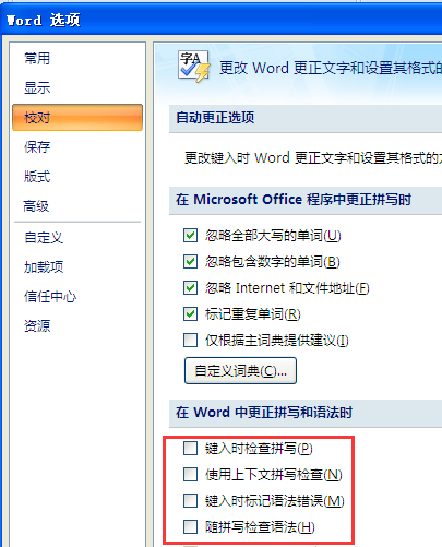 2、弹出Word选项对话框中,选中“校对”,把“在word中更正拼写和语法时”下边的如图所示的选项中去掉复选框中的对勾即可。