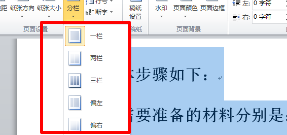 单击“页面布局”选项卡,在“页面布局”功能区中单击“分栏”按钮,打开一个下拉菜单,如下图所示,从中选择相应的栏数即可。