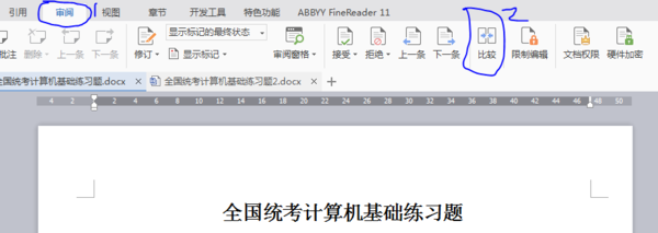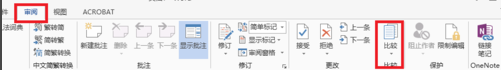 首先打开Word,切换到“审阅”选项卡下,找到“比较”,如下图所示: