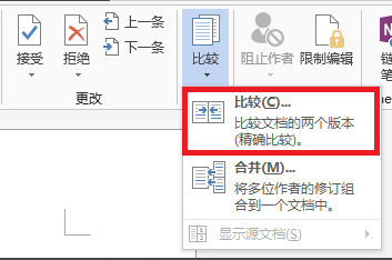 点击“比较”,下拉菜单会出现两个选项,分别是“比较(比较文档的两个版本)”和“合并(将多位作者的修订组合到一个文档中)”如图所示,这里我选择的是“比较”;