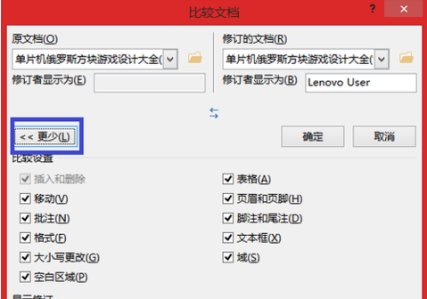 在”比较文档“对话框里面分别打开“原文档”和“修订的文档”,在【更多】里面选择”修订的显示位置“,然后点击【确定】;