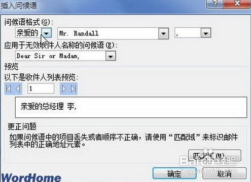第2步,打开“插入问候语”对话框,在“问候语格式”前缀编辑框中默认是Dear,用户可以输入自己的内容(如“亲爱的”),结束符号可以选择逗号或冒号。在预览位置可以看到最终插入到信函中的问候语效果,“插入问候语”对话框。