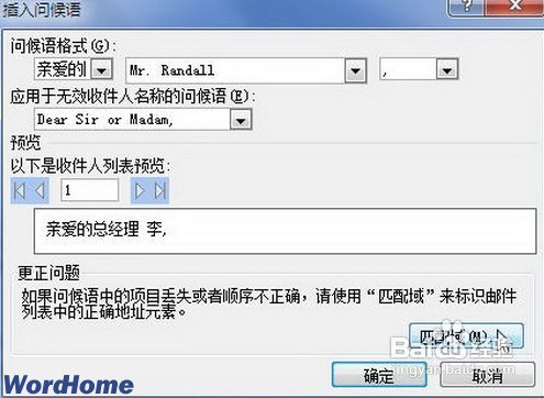第三步,默认问候语中显示的项目不合适并需要取消或修改(例如需要取消尊称“总经理”项目),则可以在“插入问候语”对话框中单击“匹配域”按钮, 单击“匹配域”按钮。