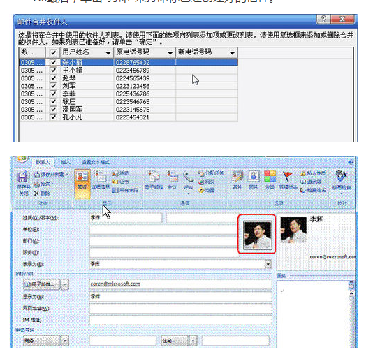 7.在选择的文件夹内,将看到所有联系人的一览表。接下来选择期望联系人并单击OK.此时,可以撰写邮件了。Word允许插入联系人列表中的各种内容到信件,只需通过在工作窗格中点击相应的对象。默认地,可以插入地址块、问候语、电子邮费或者邮费条形码。