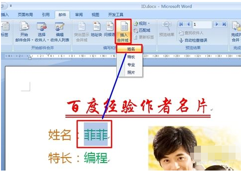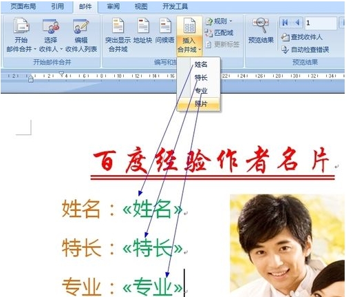 9、按键盘上的“Alt+F9”进入域代码模式,然后在“IncludePicture”后面输入双引号,然后点击“插入合并域”->“照片”项。最后再次按“Alt+F9”返回正常模式;