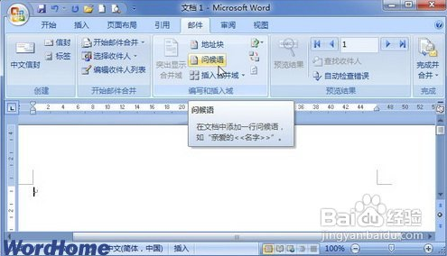 第1步,打开Word2007文档窗口,将插入条光标移动到信函开始位置。切换到“邮件”功能区,在“编写和插入域”分组中单击“问候语”按钮,单击“问候语”按钮。