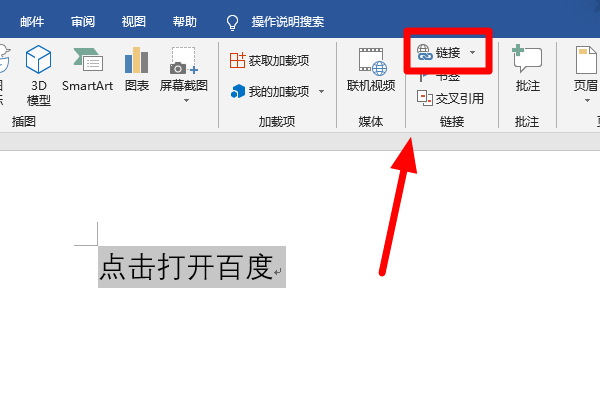 word中可以使用链接功能添加超链接,这里以添加百度官网为例。