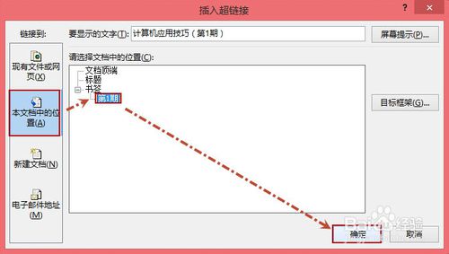 4,创建超链接B:打开“插入超链接”对话框,选择“本文档中的位置”,然后选择创建好的书签名,最后单击“确定”。