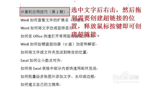 第一步:用鼠标选中作为目标超链接的文字或图像,然后单击鼠标右键,然后拖到需要创建超链接的位置,释放鼠标按键即可创建超链接。