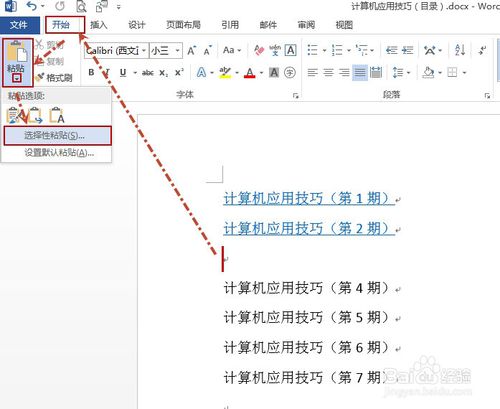 第二步:将光标定位到要插入超链接的位置,然后单击“开始”选项卡下的“粘贴”—“选择性粘贴”。