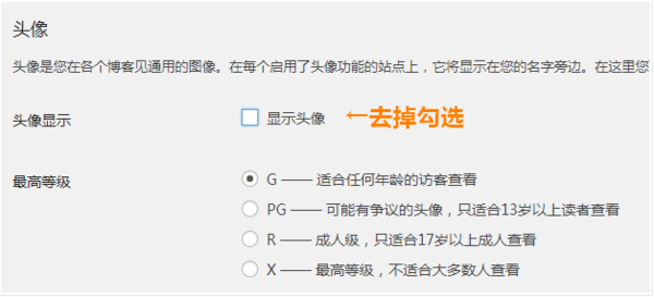 首先进入站点后台,打开 “设置” → “讨论”,向下滚动,找到 “头像” 设置区域,把 “显示头像” 勾选掉。