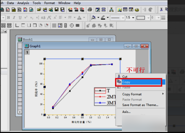 1、在origin软件中不能直接点击右键菜单中“copy”选项或者直接按快捷键“Ctrl+C”对图进行复制,因为这样复制origin的图是不行的。