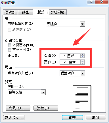 版式:页眉1.5厘米,页脚1.75厘米,页面顶端对齐。