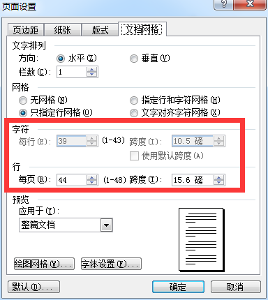 文档网格:文字排列方法为水平方向,字符每行39个字,每页44行。