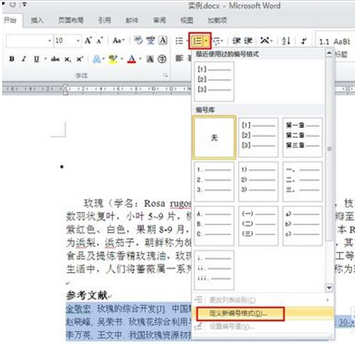 点击图示位置处的编号库,在下拉菜单中选择“定义新编号格式”。