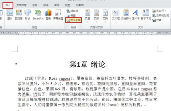 然后,我们将光标放到需要插入参考文献引用的位置,在Word的“插入”模块中选择“交叉引用”;