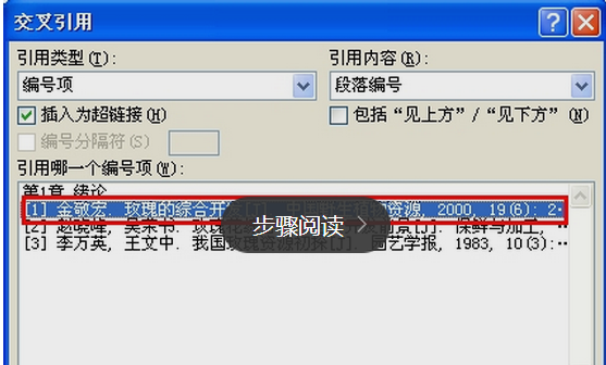 接着就可以编辑第二个参考文献。在编辑完成后,将参考文献的标注加到对应的正文中。首先将光标放置在要插入的位置,然后选择插入-->交叉引用。在弹出的对话框中选择你要插入的引用文献。