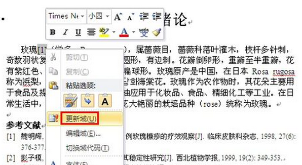 当我们的参考文献编号发生变化时,比如之前第一篇参考文献变成了第三篇,我们只需要选择文中之前插入的引用,点击右键,选择更新域,引用就会自动更新啦!