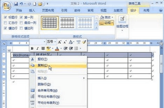 第1步,打开Word2007文档窗口,选中准备复制的整行或整列。然后右键单击被选中的行或列,在打开的快捷菜单中选择“复制”命令,如图。