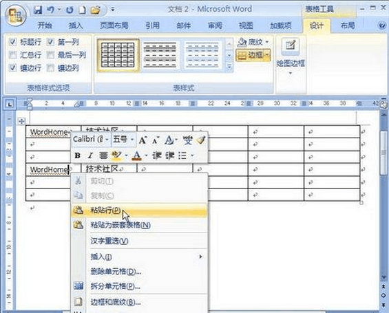 第2步,在表格中右键单击单元格,在打开的快捷菜单中选择“粘贴行”或“粘贴列”命令,被复制的单元格将被粘贴到当前行的上边或当前列的左边,如图。