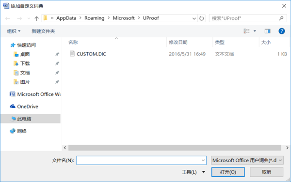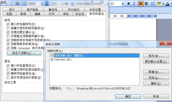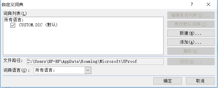 而在重新安装系统之后,将上述备份的文件复制到原始路径,然后选择“工具-选项-拼写和语法-自定义词典”,单击“添加”,添加所有当前目录下的自定义词典(*.DIC)即可。