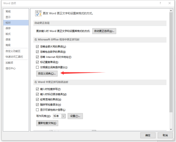 第2步,在打开的“Word选项”对话框中切换到“校对”选项卡,并单击“自定义词典”按钮。