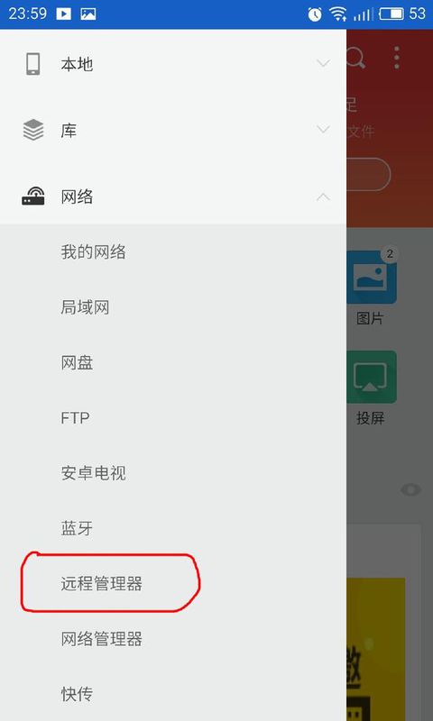 3、点“远程管理器”,“远程管理器”则手机是FTP服务端,电脑上安装的是FTP客户端,本文使用远程管理器,相对来说在电脑安装FTP客户端软件更简单;