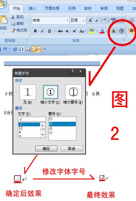 开始——圈字——文字里面输入√号——圈号选择方框,如图: