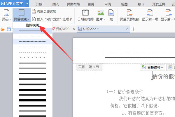 如果仅仅想去除页眉下的横线,最为便捷的就是改变页眉的样式。例如,我们在编辑页