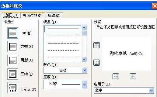式〕按钮,选择其中的“边框”。再在随后出现的“边框和底纹”对话框中选定“设置”下