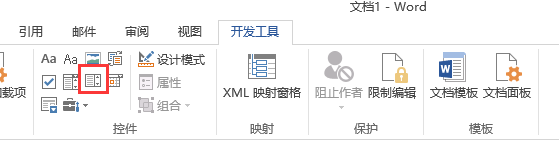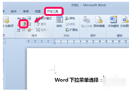 在"开工工具"选项卡,"设计模式"下,点击"下拉列表内容控件"按钮