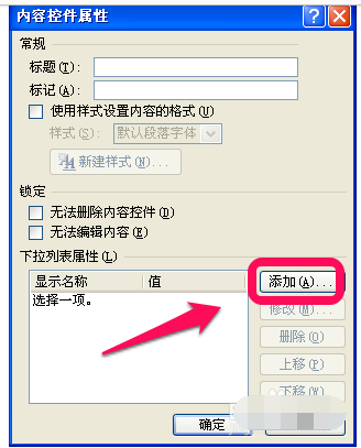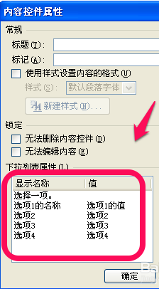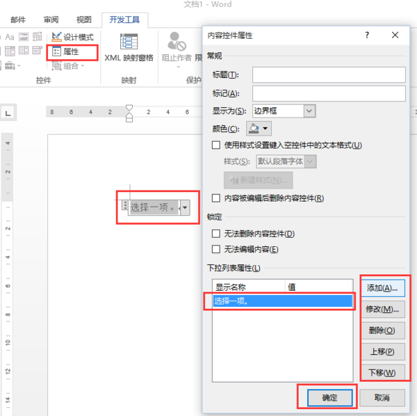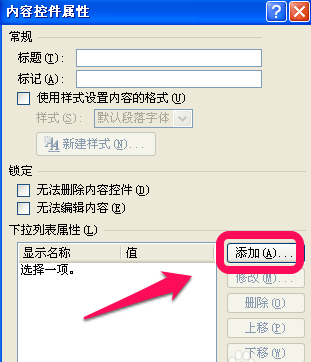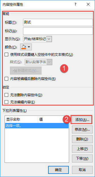在"内容控件属性"对话框中,"下拉列表属性"框中[添加]或[修改]"显示名称"及“值”即可.