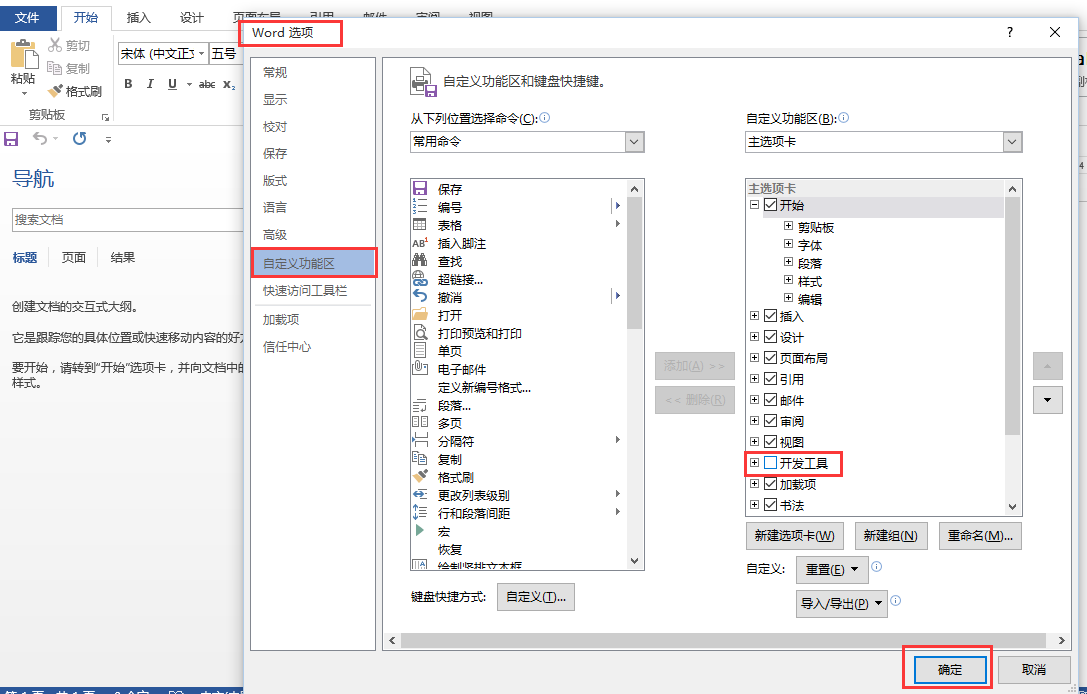 2、进入Word选项后,点击【自定义功能区】—【开发工具】,勾选上,点击【确定】。