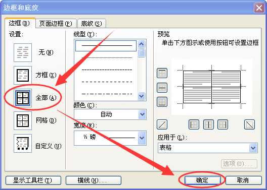 选择之后直接进入到表格边框设置界面,在这里我们要将边框去掉,并把边框颜色选为空白;