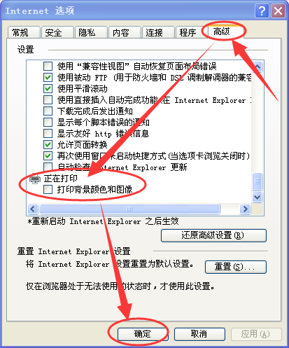 2、或者从网上下载的时候,点击IE浏览器的【工具】菜单—【Internet选项】—【高级】,勾选【打印背景颜色和图像】,最后点击【确定】即可。
