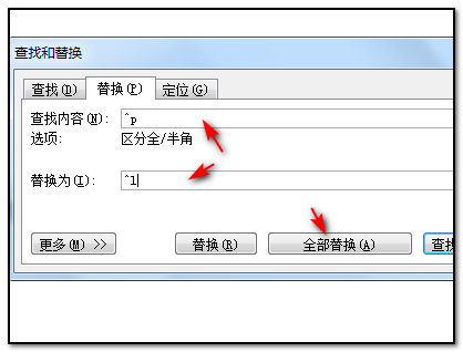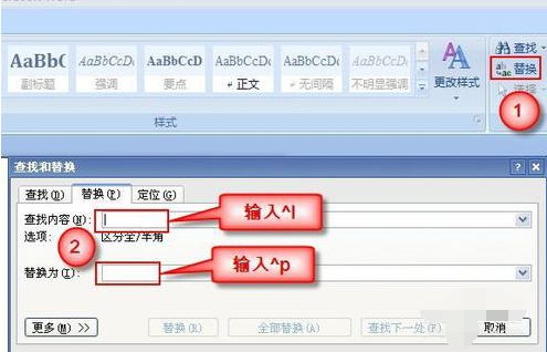 4、点击替换命令以后,弹出的界面框中在查找内容栏里输入”^p“,替换为栏里输入”^l(小写的L)“并点击全部替换;