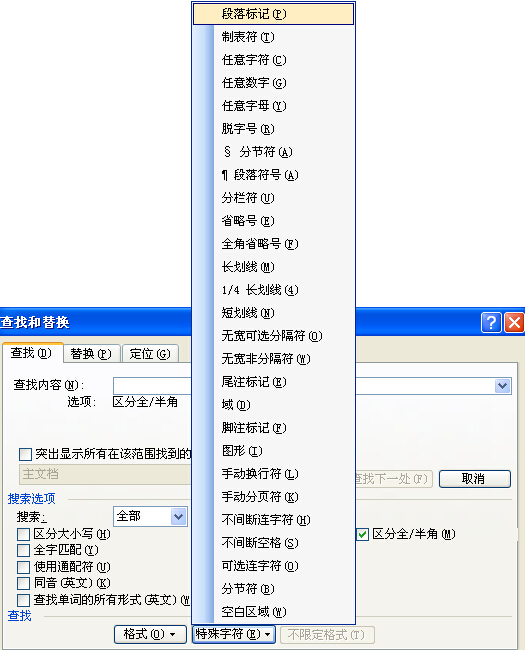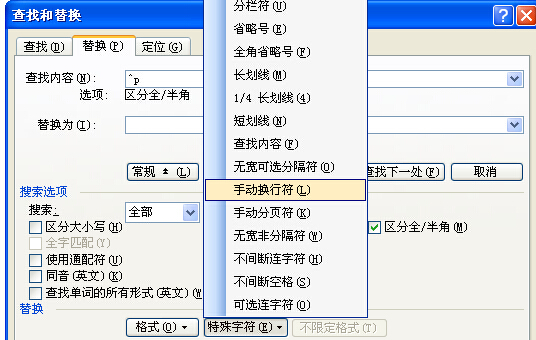在 菜单……编辑……查找中有替换选项卡。在查找内容中输入两个^p(即上文所提到的代码)(必须是英文输入状态下),也可以点开“高级”按钮,再点开“特殊字符”按钮,选择“ 段落标记”(也就是上文提到的硬回车的官名)就能自动填写进去。
