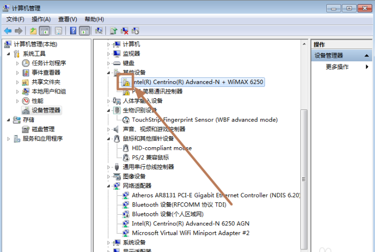 3.若需要使用上这些功能,就需要重新安装购买无线网卡对应的驱动。在设备管理器中选择无线网卡,点右键,更新驱动程序软件,不使用windos自己搜索驱动,选择注意计算机在本地选择驱动程序安装。