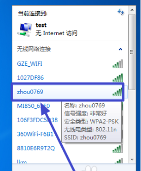 4.安装上驱动之后,连接无线网络就简单了,win7系统右下角,如图示点击图标,打开网络和共享中心,这里会显示搜索到的所有SSID,选择你的SSID点击连接。
