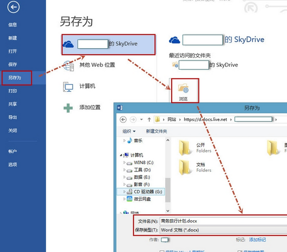 3、将需要共享的文档保存:选择“文件”菜单中的“另存为”选项,将文件保存到SkyDive网盘中;
