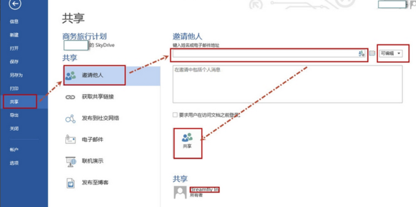 4、将文件共享给他人:选择“文件”菜单中的“共享”选项,单击“邀请他人”,输入邀请人的电子邮件(可以登录微软网盘的账号),并设置好编辑的权限,然后点击“共享”;