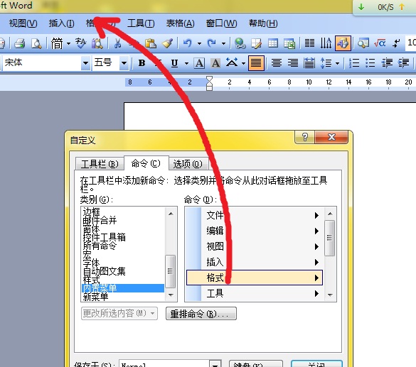 在菜单栏空白处右击(在“帮助”后边就行),选择“自定义”,打开对话框,如下图所示: